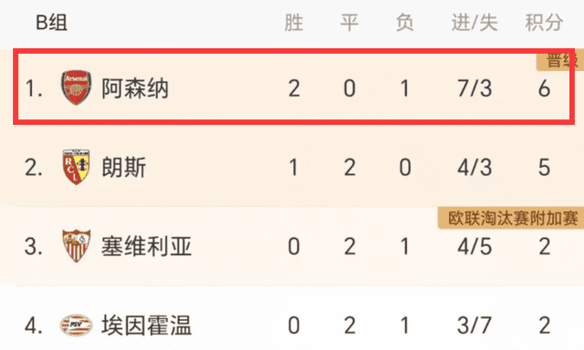 阿森纳小组头名